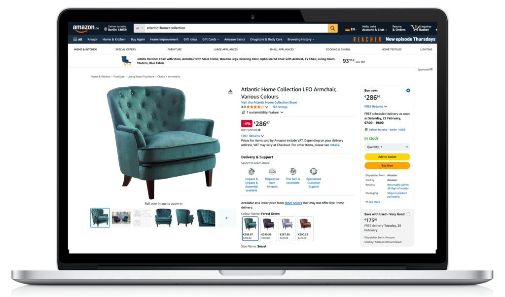 Absence of AR visualisation feature on Amazon website.